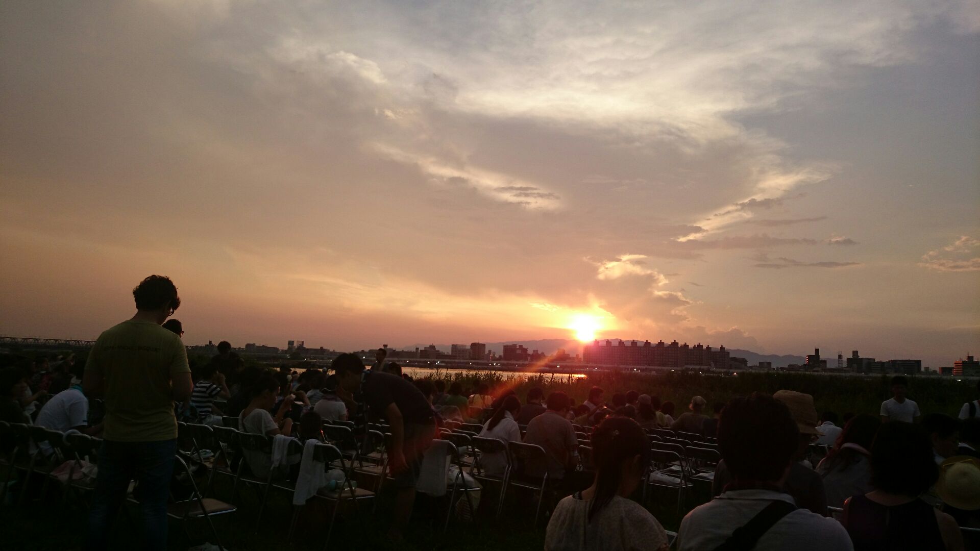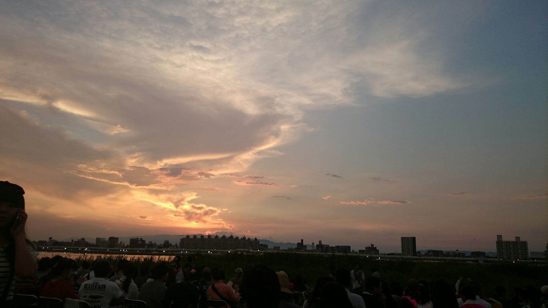 陽も傾いてきて、淀川の花火大会会場に向かいます。