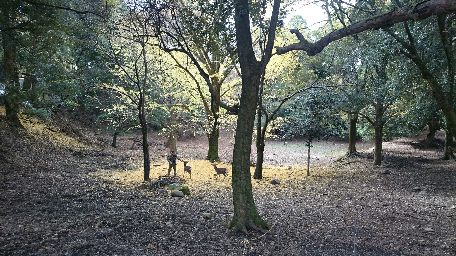 銀杏の黄色の絨毯に鹿。